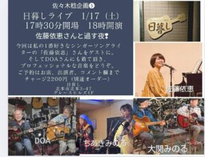 1月172026 佐々木稔企画⑤・ 佐藤依恵さんと過ごす夜! こちらのイベントは満席となりました。 来年最初のライブイベントは1月17日(土)、毎回大好評の佐々木稔企画第5回「佐藤依恵さんと過ごす夜!」です。 が、大変申し訳ありませんが、告知前に満席(狭いお店なもので…)となってしまいました 次の機会に是非! 《佐々木稔企画⑤・ 佐藤依恵さんと過ごす夜!》 ◇出演:佐藤依恵、DOA,ちあきとみのる、大関みのる ◇日時:2026年1月17日(土) ◇時間:開場17:30 スタート18:00 ◇料金:チャージ2200円+オーダー(※当日はドリンク中心のライブ用メニューとなります)